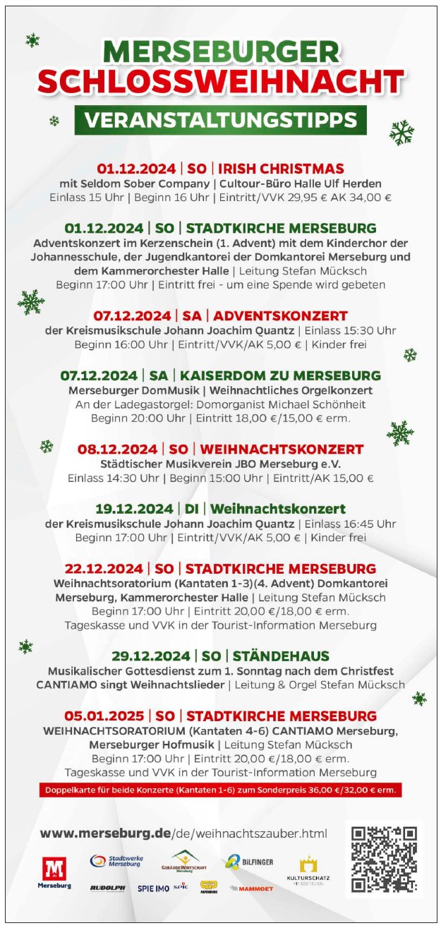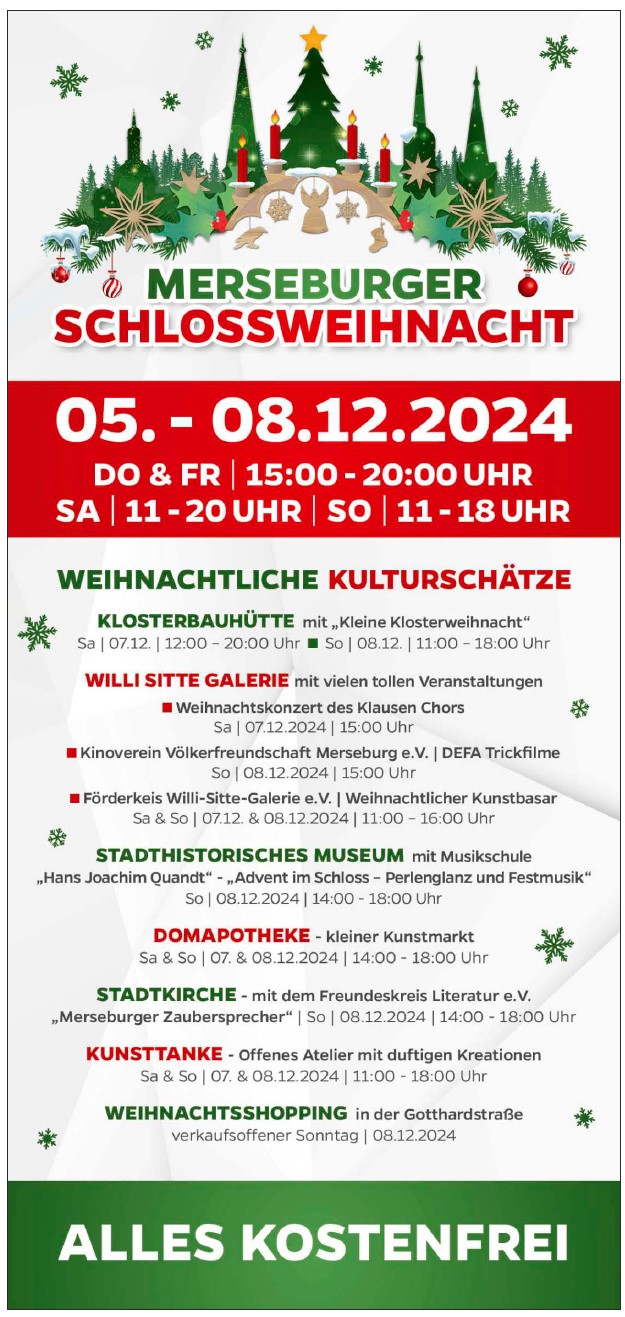 Alle Jahre wieder verwandelt sich das imposante Dom- und Schlossensemble in Merseburg in eine traumhafte Weihnachtswelt. Wir laden Sie herzlich ein, die besondere Atmosphäre unserer „kleinen, feinen“ Schlossweihnacht im herrlichen Ambiente des Schlossinnenhofs zu genießen.