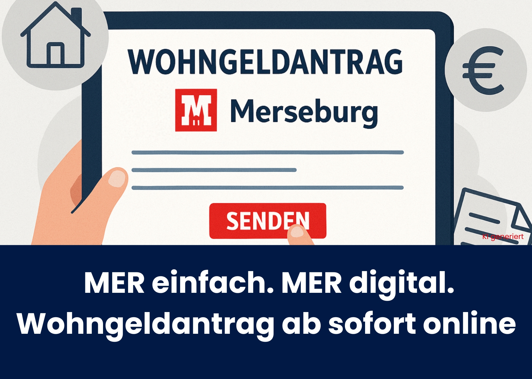 Symbolbild mit Schriftzug "Wohngeldantrag" und dem Merseburg-Logo