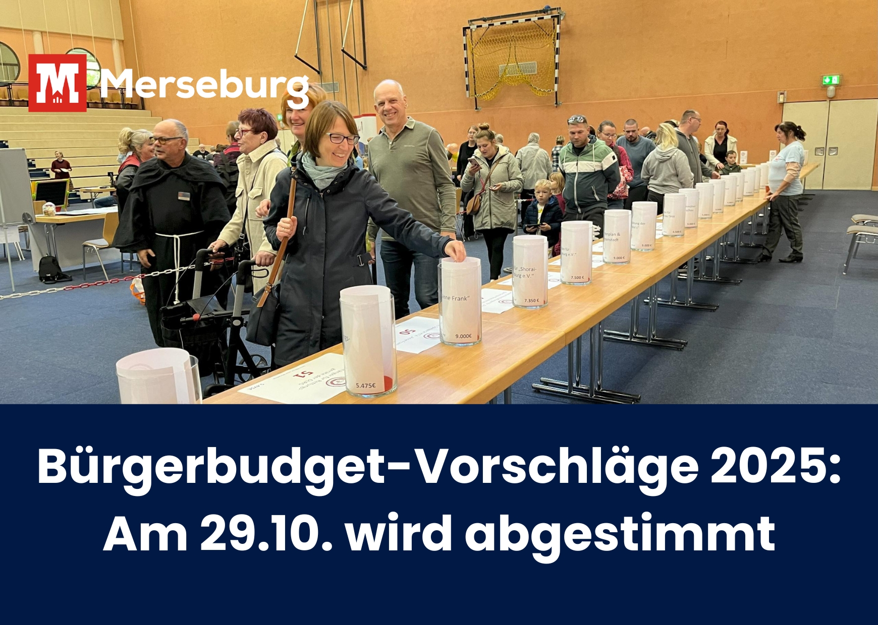 Es ist wieder so weit: Zum vierten Mal können die Merseburger und Merseburgerinnen mit drei Stimmtalern entscheiden, welche Projekte im Rahmen des Bürgerbudgets umgesetzt werden sollen. Insgesamt 70.000 Euro werden dafür aus dem städtischen Haushalt bereitgestellt. Kommen Sie am 29. Oktober in die Merseburger Rischmühlenhalle und geben Sie Ihre Stimme in der Zeit von 15:00 bis 18:00 Uhr ab. Jede zur Abstimmung berechtigte Person kann maximal drei Stimmen vergeben.